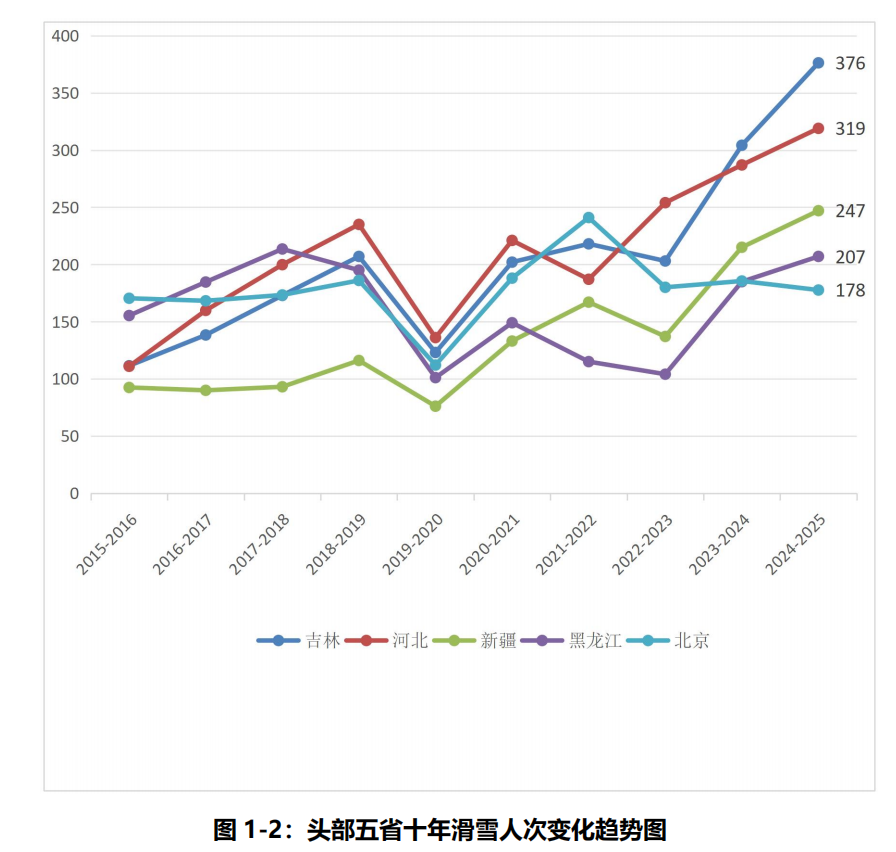 從連續(xù)十年的數(shù)據(jù)來看,吉林、河北、新疆、黑龍江、北京已形成中國滑雪目的地的頭部五省格局,華北、東北兩大區(qū)的滑雪人次占比均超過25%,合計連續(xù)兩年超過全國總量的一半。