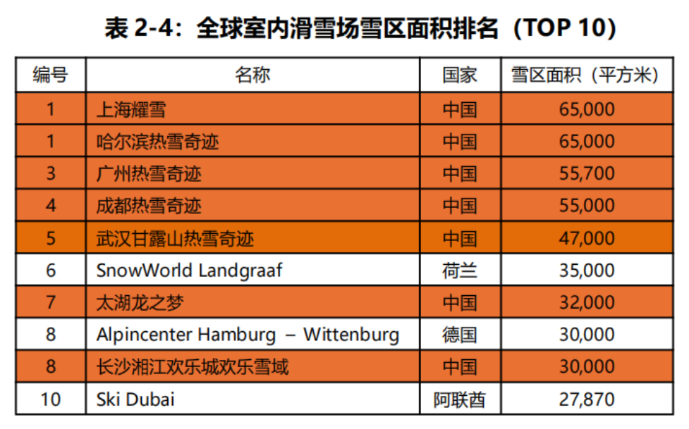 在國際對比中,中國已成為室內(nèi)滑雪場的絕對領跑者。全球雪區(qū)面積排名前十的室內(nèi)滑雪場中,中國占據(jù)七席,且前五名全部位于國內(nèi),其中上海耀雪、哈爾濱熱雪奇跡面積最大,超過6萬m²。隨著深圳、長春等新項目的投入運營,中國在室內(nèi)滑雪場全球前十中的占比預計將達到九席。