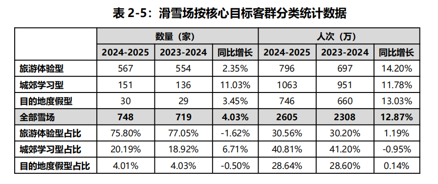具體來看,旅游體驗型雪場數(shù)量占比最大,達到75.8%,成為覆蓋最廣、最普及的雪場類型。城郊學習型雪場雖然數(shù)量僅占20.19%,但增速最快,累計服務滑雪人次最多,達到1063萬,在培養(yǎng)初級滑雪用戶和普及滑雪運動方面發(fā)揮著重要作用。符合目的地度假型特征的雪場共有30家,比上年增加1家,但滑雪人次增長了13.03%,共創(chuàng)造746萬滑雪人次,占全國總人次的28.64%。雖然數(shù)量僅占4%,但貢獻了近三分之一的滑雪人次,其中吉林“三萬一湖”滑雪度假區(qū)、新疆阿勒泰三大雪場以及河北崇禮集群,已成為國內(nèi)度假型雪場的典型代表。據(jù)新華社報道,去年進入11月后,可可托海國際雪場日均游客量超過2000人,其中90%的游客來自外省,顯示出目的地度假型雪場在吸引深度滑雪消費群體和帶動消費方面具有極強的拉動力。
